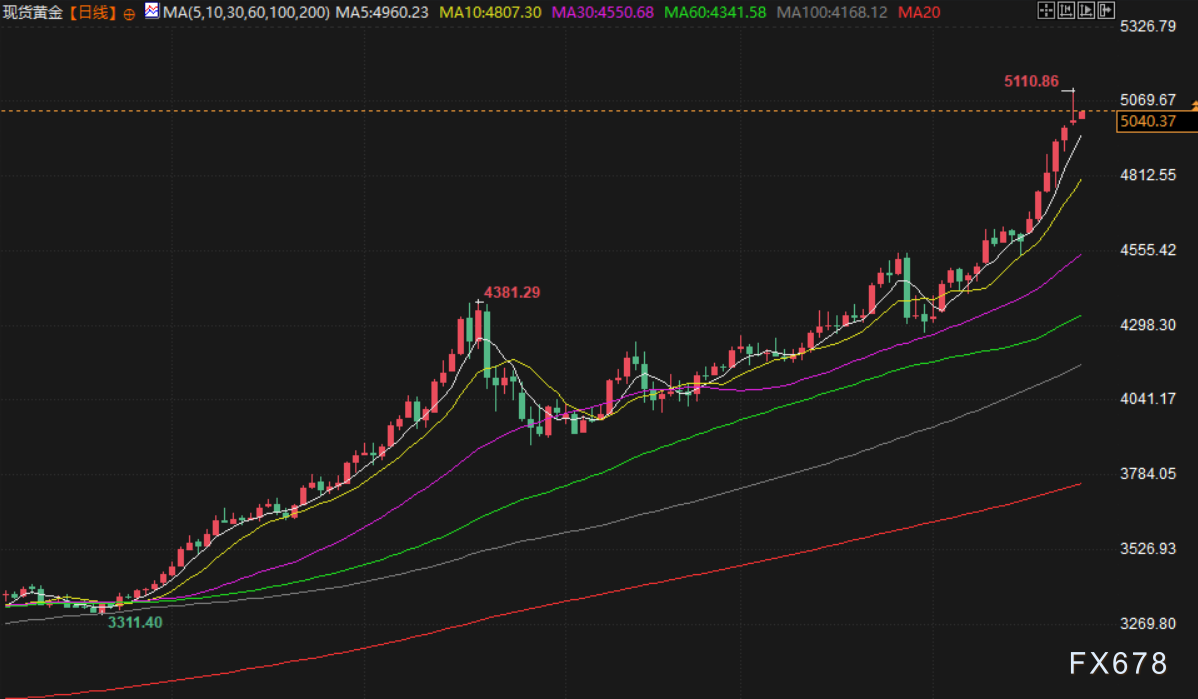 现货黄金周一飙升至历史新高,突破每盎司5100美元关口,主要受到地缘政治紧张局势升级所引发的强劲避险买盘推动。